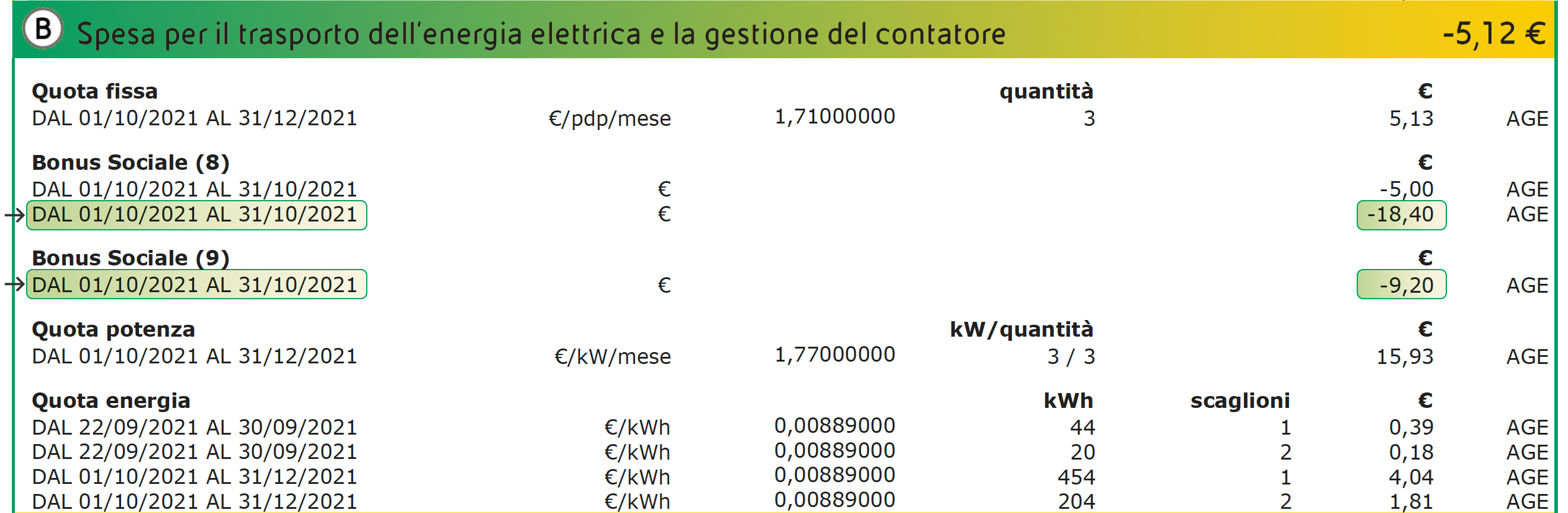 All’interno del box 'Elementi di Dettaglio Luce' nella sezione B - 'Spesa per il trasporto dell’energia elettrica e la gestione del contatore', è visibile l’inserimento delle rate integrative mensili di Bonus Sociale da €18,40 (per disagio economico) e €9,20 (per disagio fisico), importi che potrebbero variare in base alla tipologia di Bonus Sociale già in essere sul cliente.