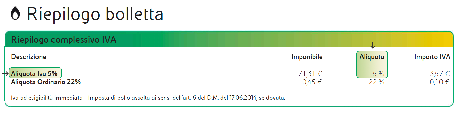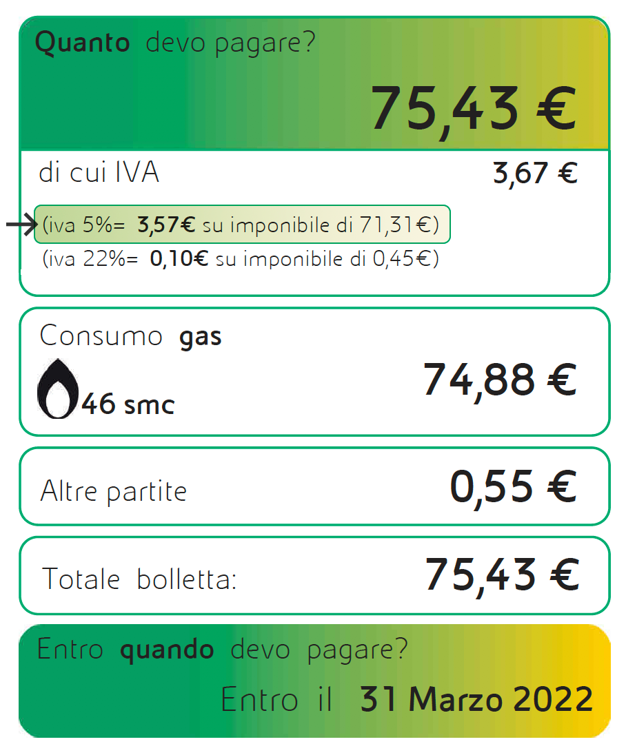 Per la bolletta gas, è prevista l’applicazione dell’IVA al 5% sui consumi e sulle quote fisse riferite al periodo di competenza 01/10/2021 - 30/06/2022.