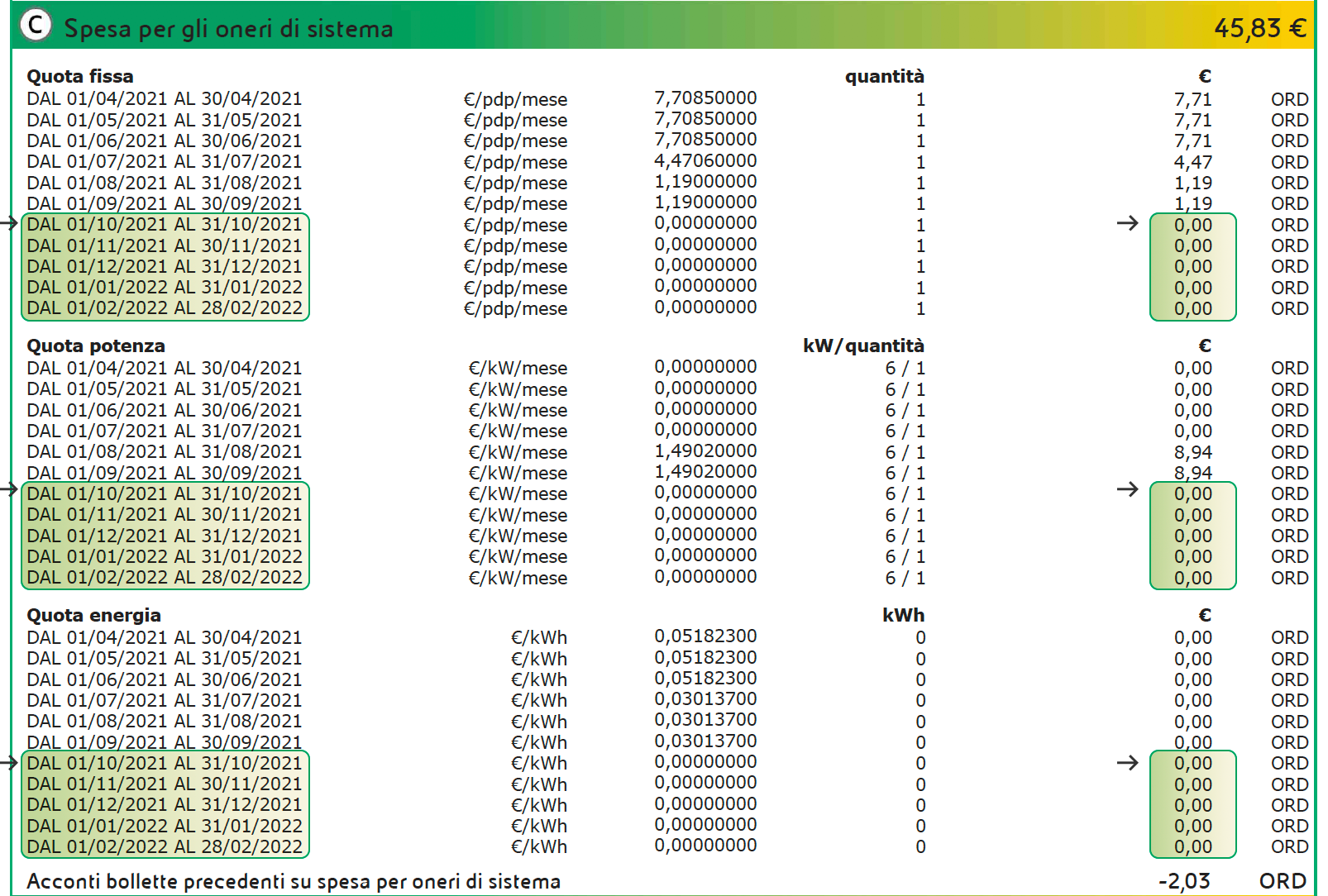 All’interno del box 'Elementi di Dettaglio Luce' nella sezione C - 'Spesa per gli oneri di sistema' è visibile l’azzeramento della Quota fissa, Quota potenza e Quota energia per tutte le utenze domestiche e per quelle non domestiche in bassa tensione con potenza disponibile fino a 16,5 kW, e dal 01/01/2022 sono annullate anche per le utenze con potenza disponibile pari o superiore a 16,5 kW, anche connesse in media e alta/altissima tensione o per usi di illuminazione pubblica o di ricarica di veicoli elettrici in luoghi accessibili al pubblico.